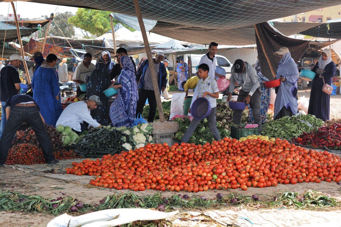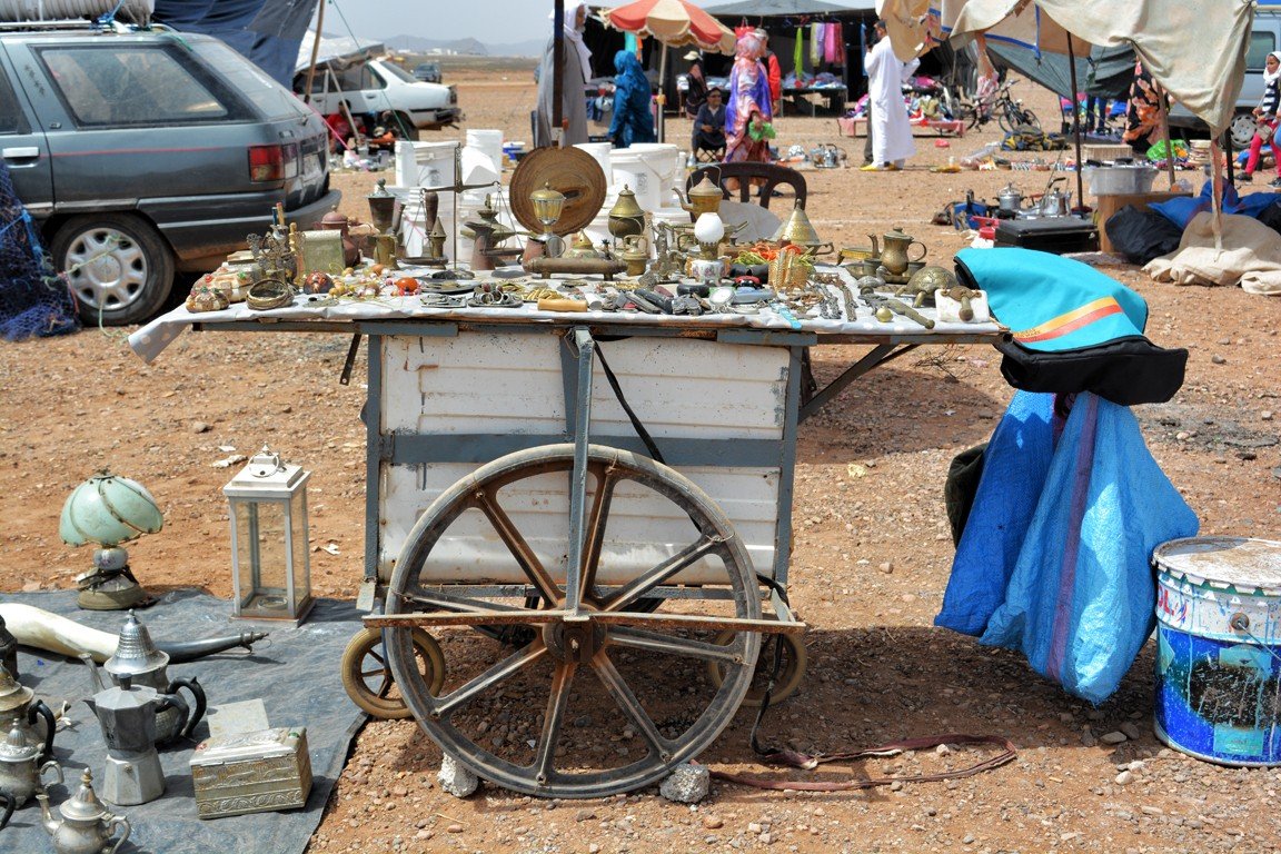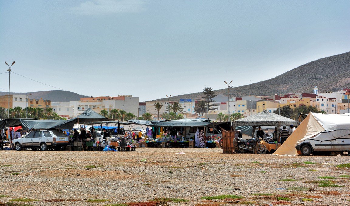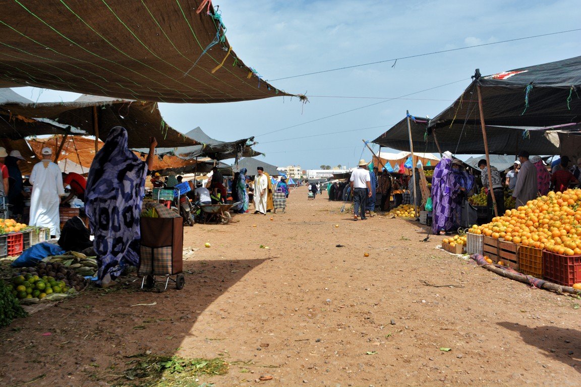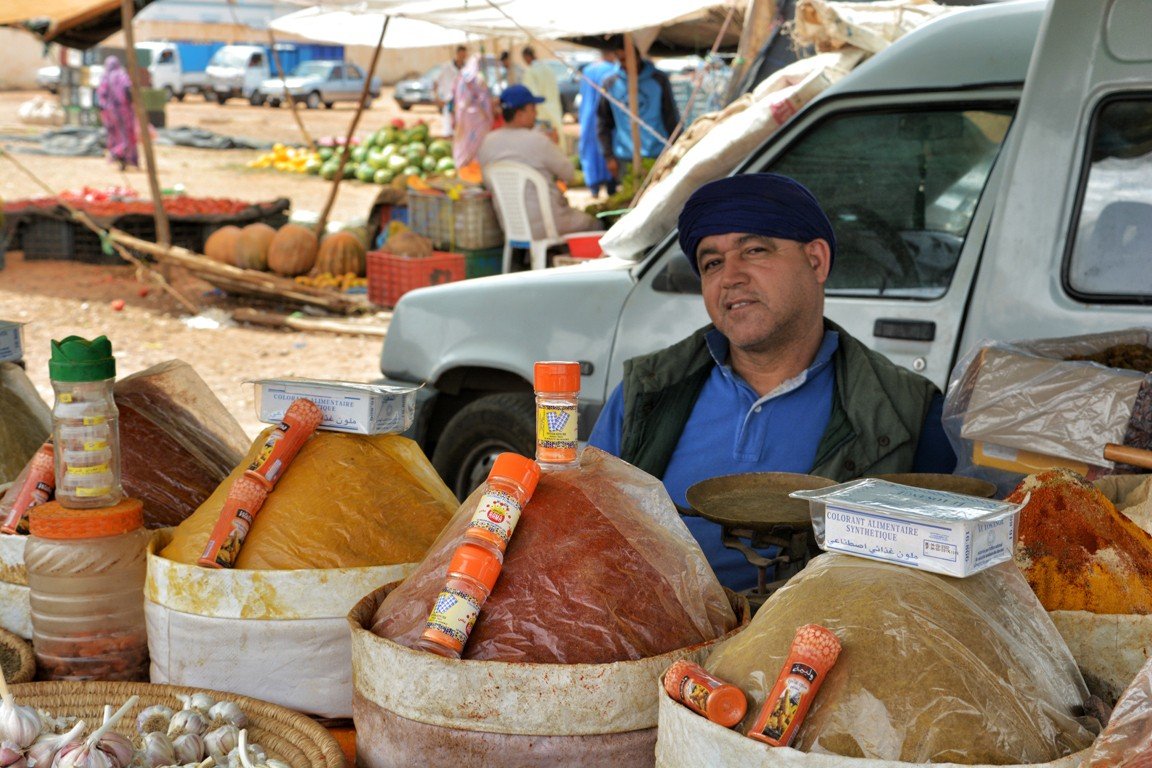 Nosotros vivimos en Sidi Ifni (antigua colonia española en la costa sahariana de la que ya os conté en otro post) y los domingos es nuestro día de zoco. Para mí es un día especial porque, además de hacer mi compra semanal, lo dedico a sociabilizar con los habitantes de esta región que ahora nos acoge. Ir al zoco significa tomarme un té con Rafa o con algún amigo en una de tantas cafeterías frente al mercado. Llegar al zoco es saludar a Hassan y conversar con él, es un señor muy amable que fabrica anillos utilizando monedas de cincuenta céntimos de euro y madera de cedro, unas piezas realmente bonitas que expone cada domingo en su puesto. Me gusta pasear por el zoco y no dejar de pasar por ninguna de sus calles para ver todo lo que allí se vende. Mi lugar favorito en el zoco es la zona donde se exponen frutas y verduras, es un espacio a rebosar de colores vivos y frescos, donde me entretengo más de lo habitual. También disfruto en los puestos de mieles de la zona o el de los frutos secos, que siempre te hacen probar una y otra vez sus ricas mercaderías. Poco a poco voy cargando mi bolsa y, cuando ya no puedo tirar de ella, vuelvo a casa al final de la mañana. Esta afición a los zocos me ha llevado a escribir este post, con la intención de que conozcáis más a fondo cómo funcionan y qué significan para los marroquíes.