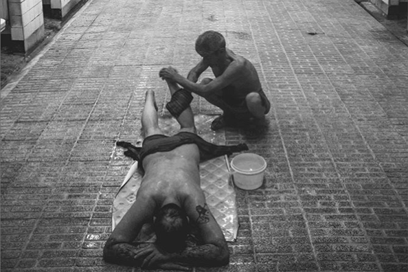 La segunda habitación suele ser la más concurrida, ya que mantiene una temperatura bastante tolerable para todos los usuarios, por este motivo, es el lugar idóneo para realizar el ritual del baño. Cuando llegas a la sala, echas un vistazo para buscar tu rincón, el lugar donde vas a permanecer durante tu estancia en el baño, casi todas las mujeres lo hacen en esta sala, sentadas en sus alfombrillas y delimitando su espacio con los cubos. Algunas, previamente, pasan un rato en la tercera sala, la más caliente, con el fin de dilatar sus poros antes de proceder a la exfoliación.