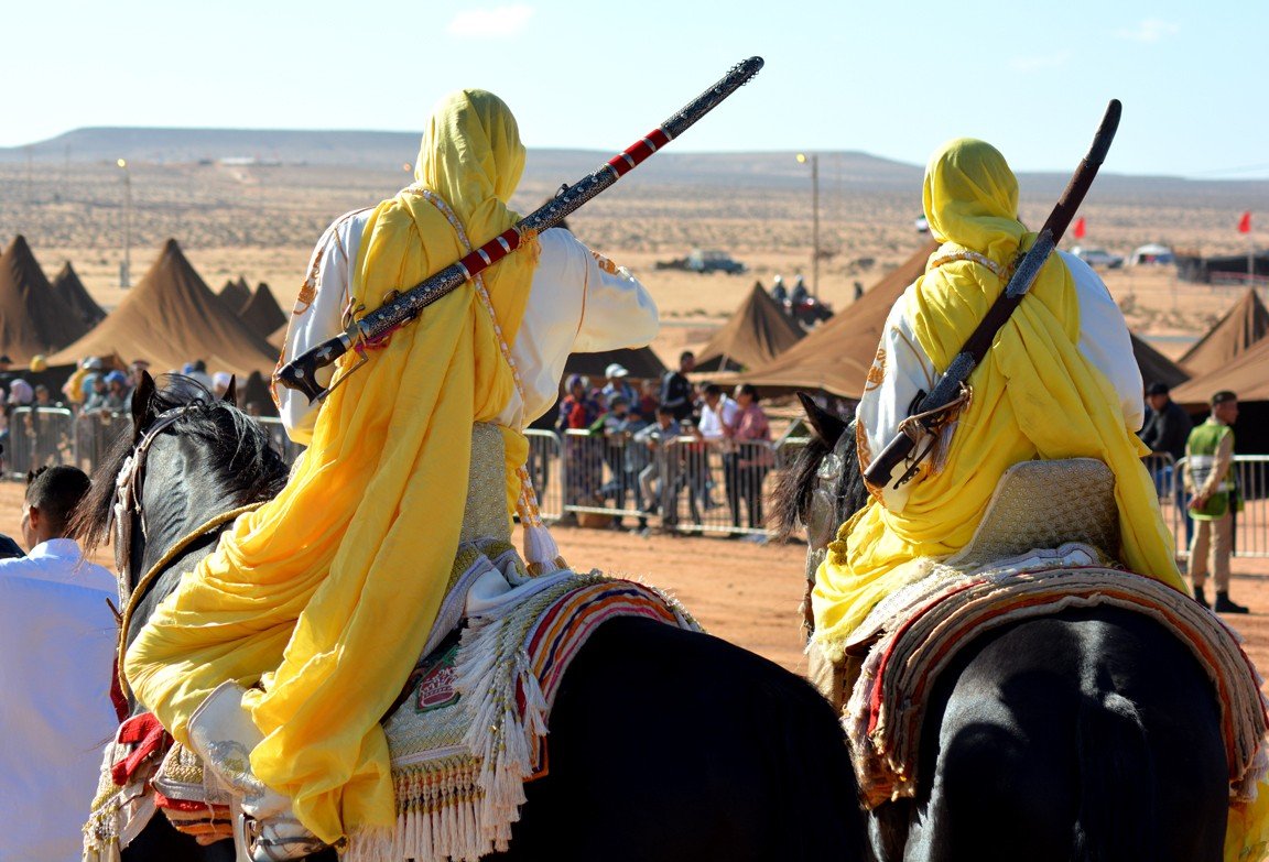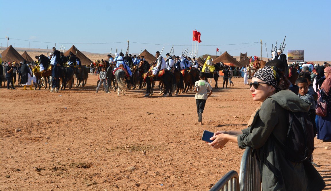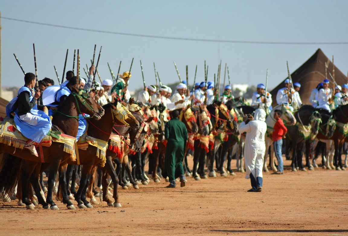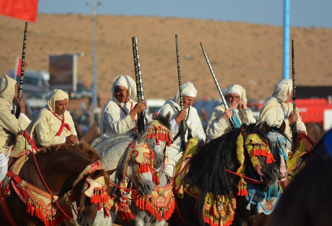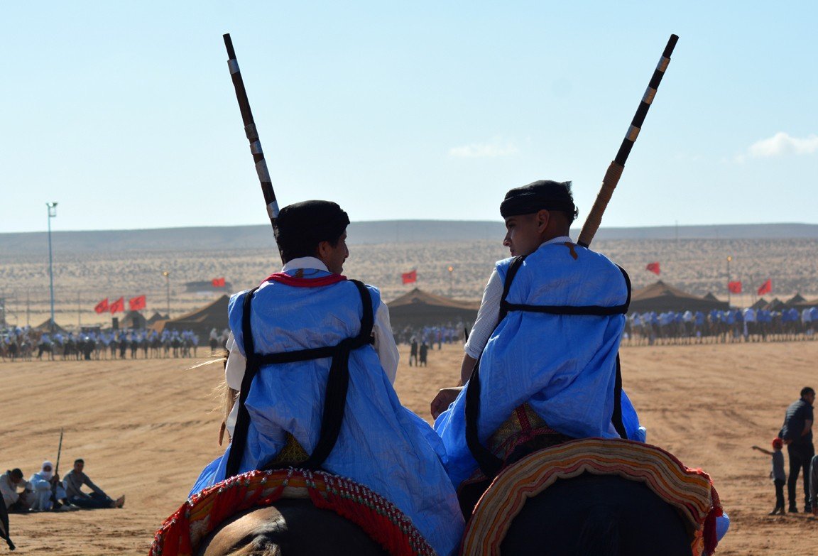 En todas las ediciones del mussem está presente la celebración de la Tbourida o Fantasía (de la que ya hemos hablado en un post anterior). Se trata de una representación coreografiada de una carga de ataque de los miembros de una tribu amazige, que se ha convertido en el punto culminante del Mussem de Tan-Tan. Los jinetes sobre sus magníficos caballos se convierten en los protagonistas de una de las actividades más estéticas del festival. El galope de los guerreros retumba a través de las arenas del desierto, sus túnicas ondean al viento y sus rifles se alzan en el aire antes de vociferar un grito de guerra que culmina con el disparo sincronizado de sus rifles.