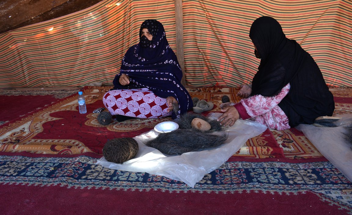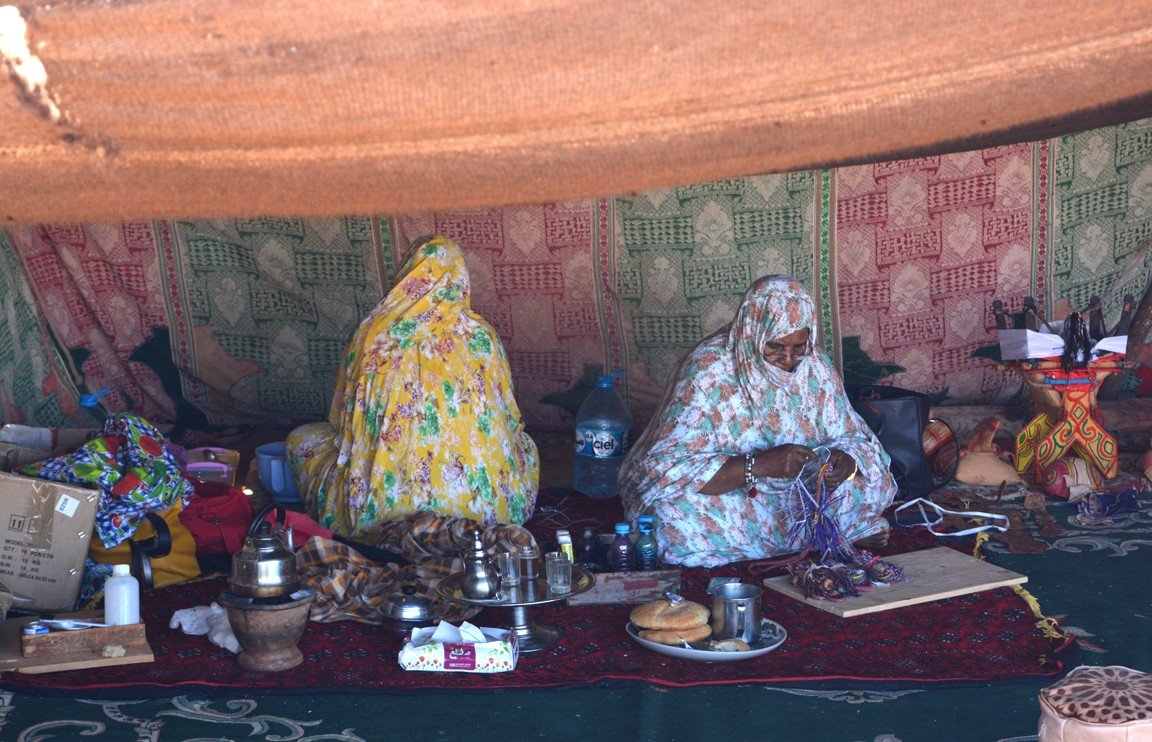 Llegué a Tan-Tan con gran interés por conocer la artesanía y otros aspectos culturales de las distintas tribus saharauis. La Maison de l’Artisan es el lugar de acogimiento de algunas muestras artesanas y sus procesos de elaboración. Al entrar, sus expositores me parecieron escasos y poco diversificados. En algunas tiendas las mujeres tejían en telares rudimentarios o elaboraban algún producto, como la leche agria, a la manera tradicional. En otra jaima se representaba una ceremonia de casamiento algo artificial, creo que era una exhibición fingida para el público y no real, lo que resta bastante autenticidad al mussem. La enseñanza del Corán también suele ocupar un espacio en la Maison de l’Artisan, donde, en el interior de una tienda, un grupo de niños memorizaba en voz alta las suras del Corán, algo que, en principio, no debería formar parte de la identidad de las tribus saharianas.