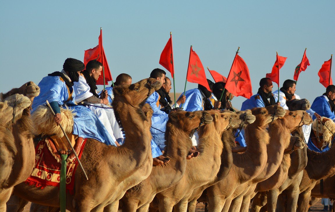 La procesión de camellos es otra imagen singular del mussem, donde los jinetes de las distintas tribus nómadas, a lomo de sus dromedarios, cantan canciones tradicionales que conmueven a los espectadores. Por todo el recinto, largas filas de mujeres vestidas con trajes elaborados y coloridos, con las manos cubiertas de atractivos tatuajes de henna, deambulan entre los caminos de la feria siendo a la vez espectadoras y protagonistas del estilo de vida nómada.