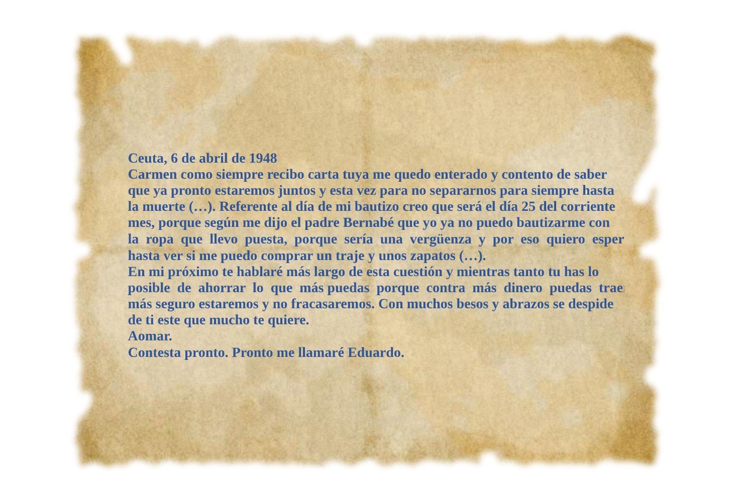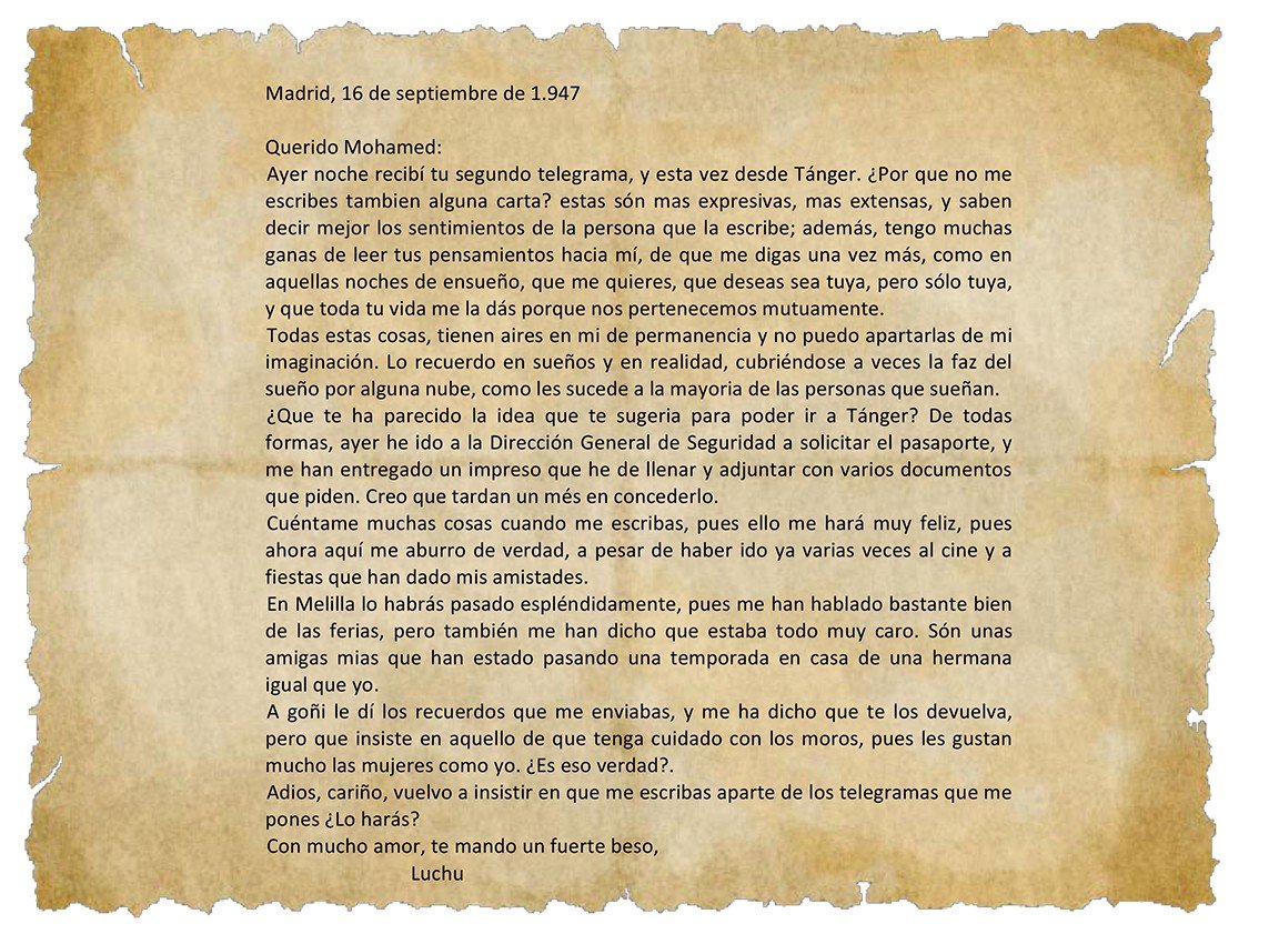 Algunas de estas almas del pasado todavía existían milagrosamente en pleno siglo XXI. A María, viuda de Abdeslam, la conocí en 2004 en un piso del ensanche de Tetuán. Y años más tarde la encontré en una carta, escribiendo a su futuro esposo. Fue un encuentro gris, como las fotos en blanco y negro de la época. En este caso, la amargura de los conflictos familiares había quemado el recuerdo de aquellas relaciones pioneras y desafiantes. La memoria puede ser también muy amarga.